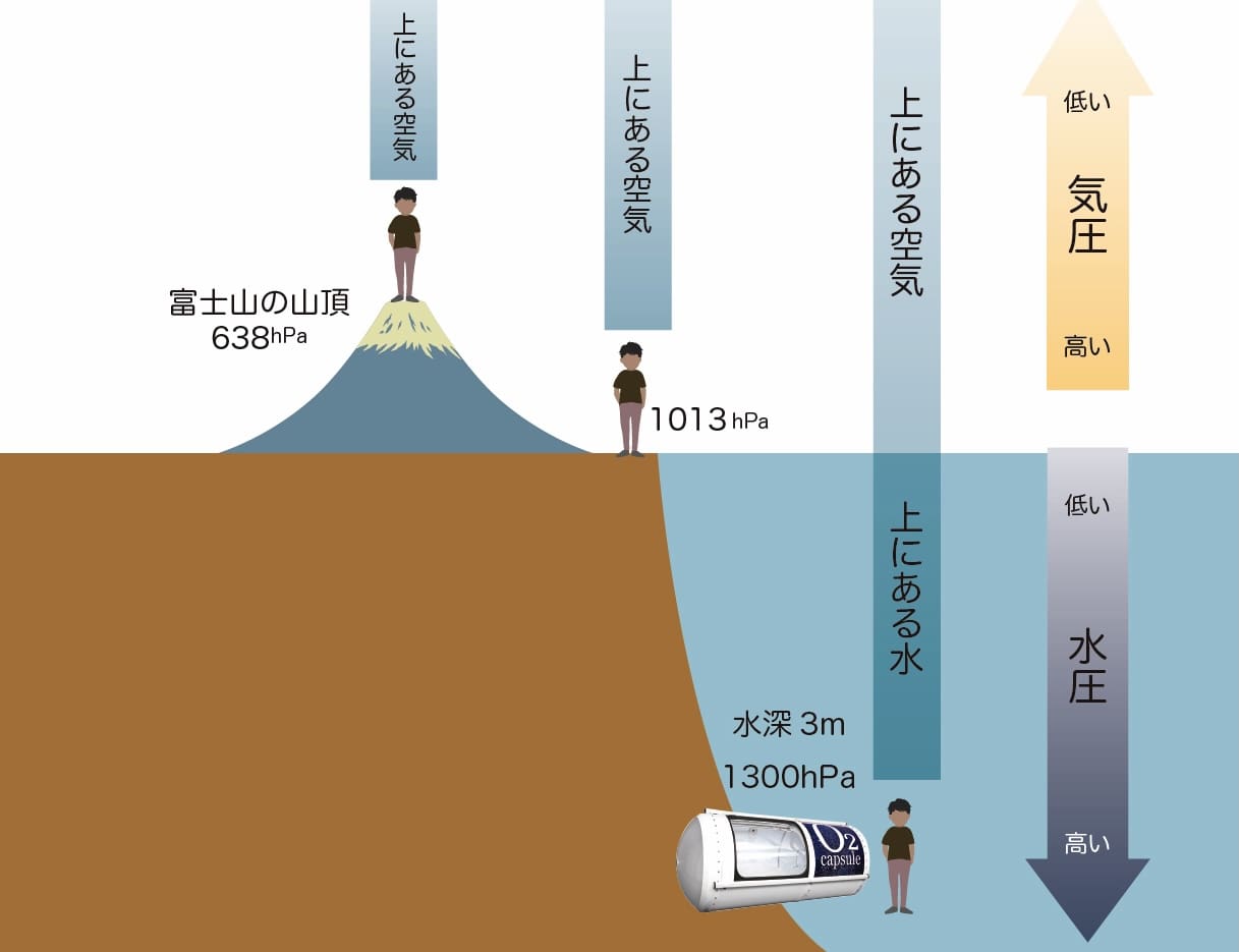 酸素カプセルは、水深3mと同じ気圧を体験することができます